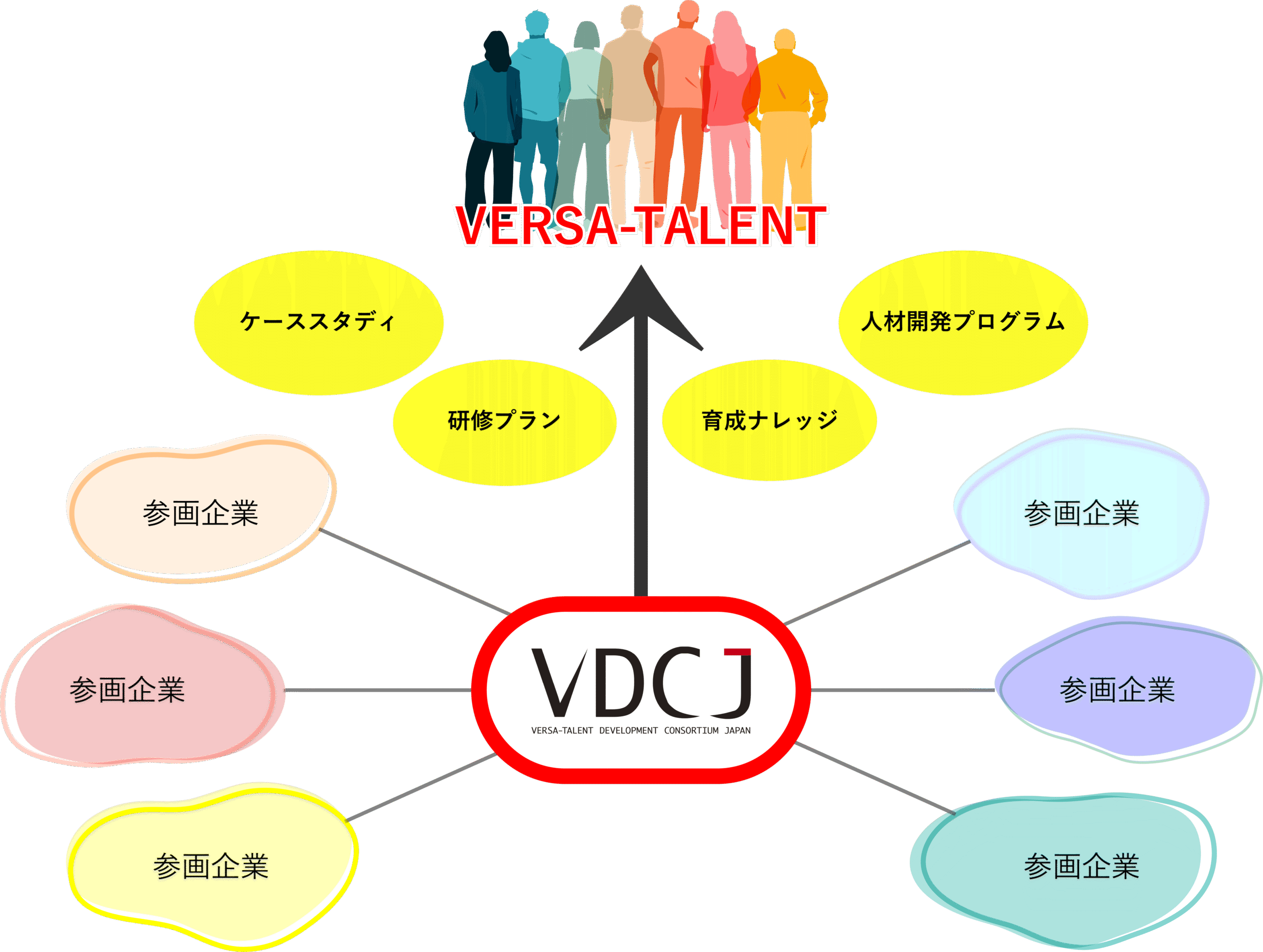 VDCJは、業界や業種を越えた、人材育成における情報交換と協働のプラットフォームです。自社の育成プログラムや研修制度ではカバーしきれない、新たなテクノロジーや求められるスキルを相互に持ち寄ることで、高いレベルでマルチに活躍できる人材を育成する仕組みを作っていきます。
